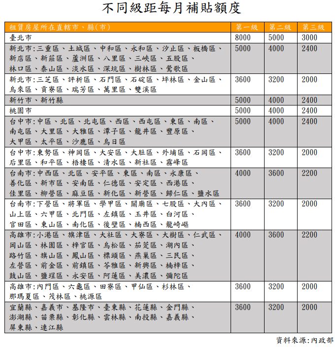 - 補貼額度: 根據所在縣市的租金水平,每月補貼額度在2,000元至3,000元不等。